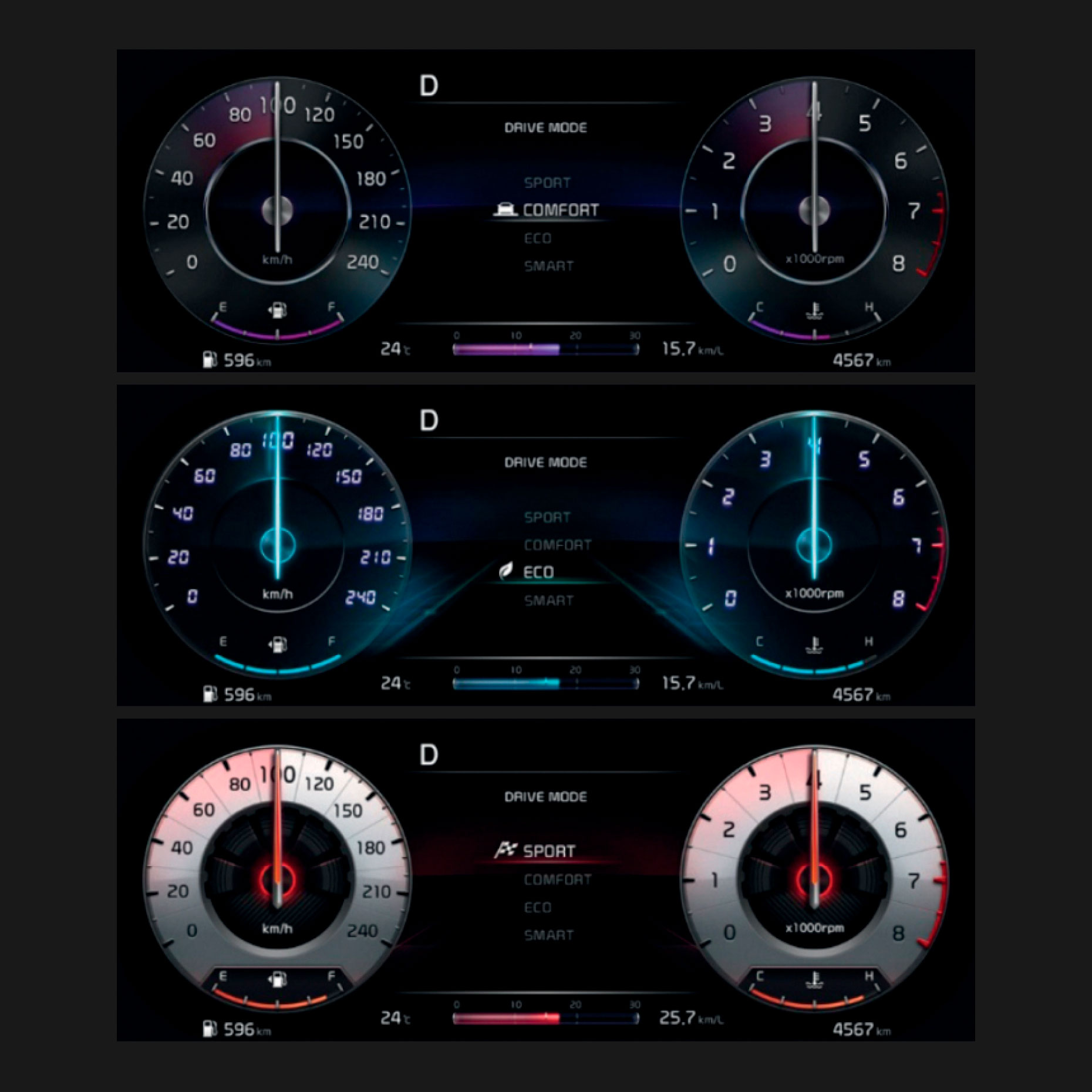 Информация на 12,3-дюймовой цифровой панели оформляется по-разному в зависимости от режима вождения, который Вы выбираете (Eco, Smart, Sport или Normal).