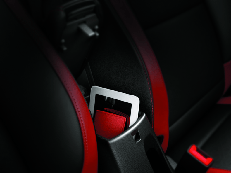 Красная строчка украшает сиденья, отделку и покрытие рулевого колеса, придавая автомобилю спортивный антураж.