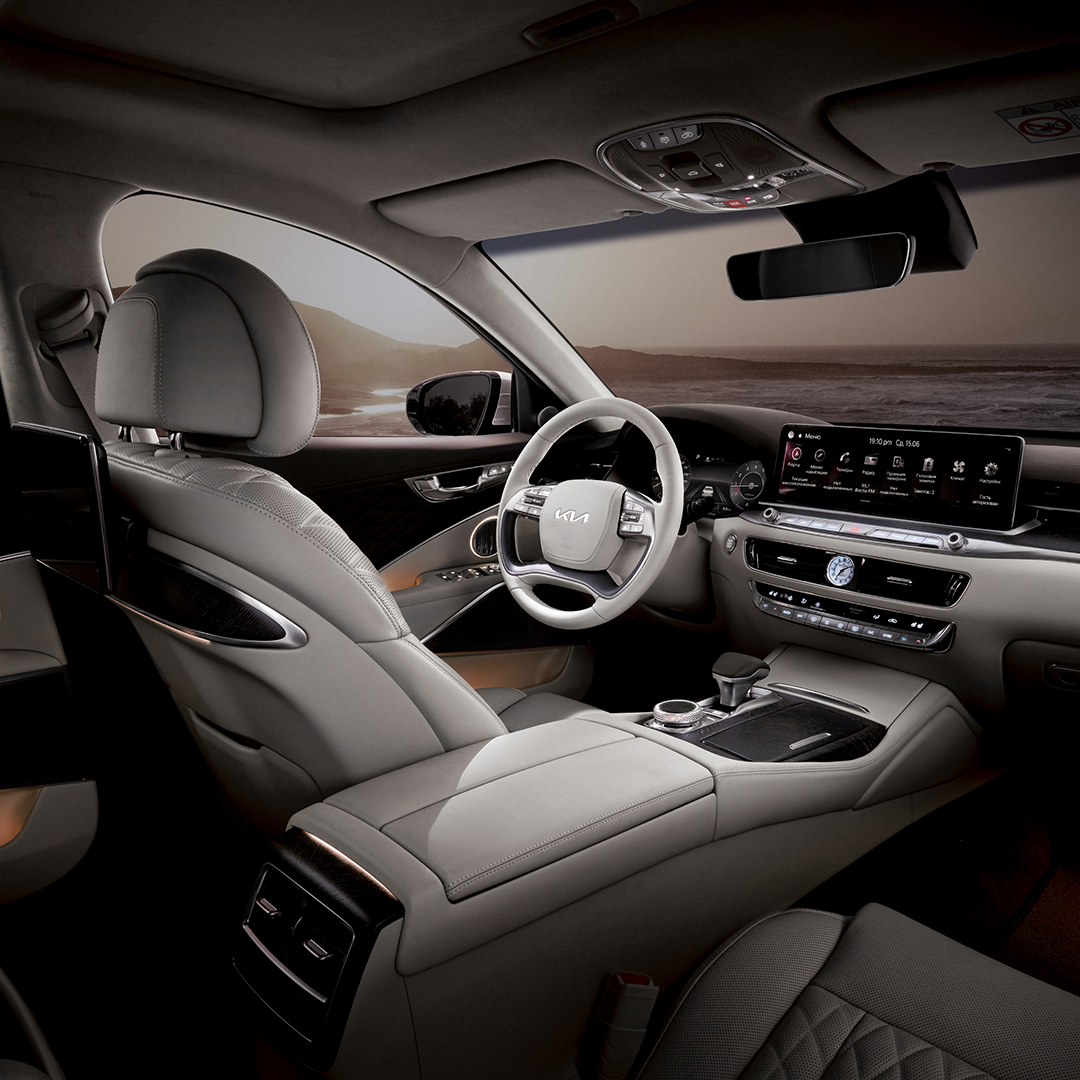 В интерьере К9 дизайнеры смогли воплотить гармонию традиционной роскоши и современного высокотехнологичного стиля. Флагманский седан получил новейшую информационно-развлекательную систему и обновленный комплекс систем помощи водителю Drive Wise.
